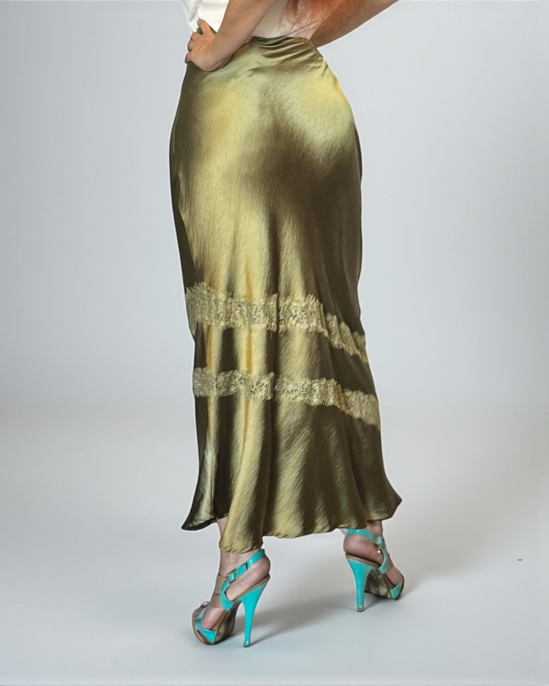 Elegant bell-cut skirt with a figure-hugging silhouette and flared hem.