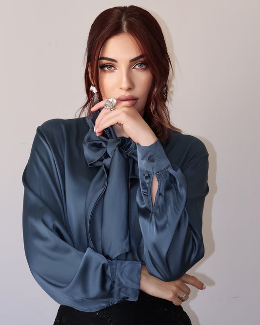 Шелковая блузка с бантом на шее (голубовато-серая)