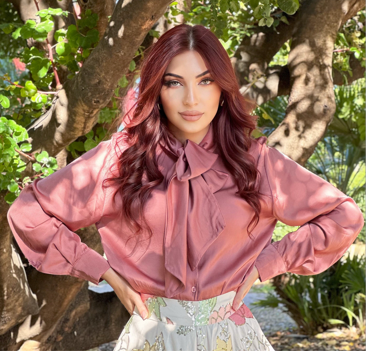 Шелковая блузка с бантом на шее (пыльно-розовый)