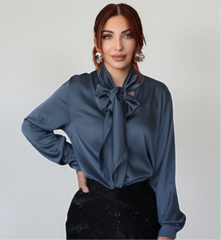 Шелковая блузка с бантом на шее (голубовато-серая)