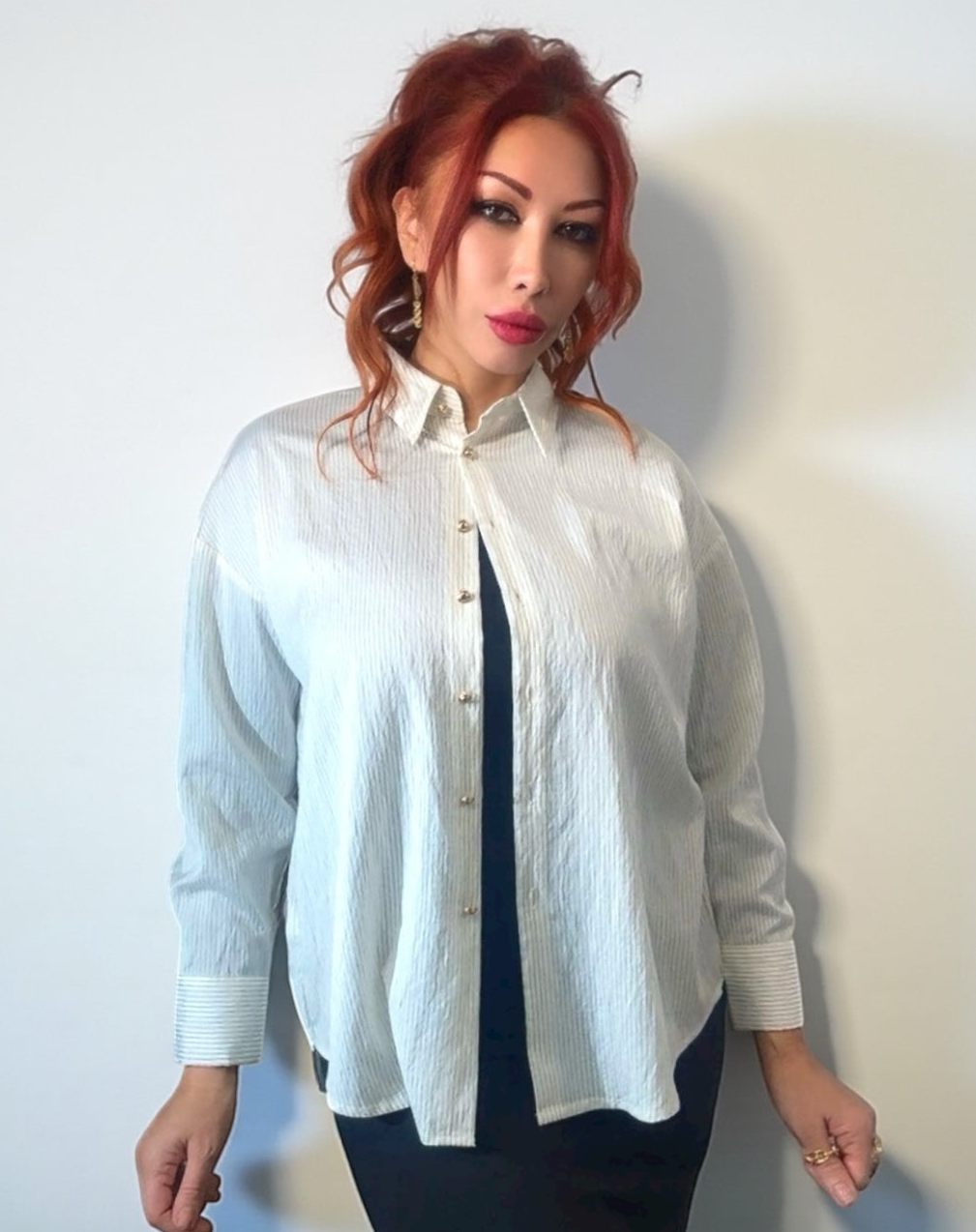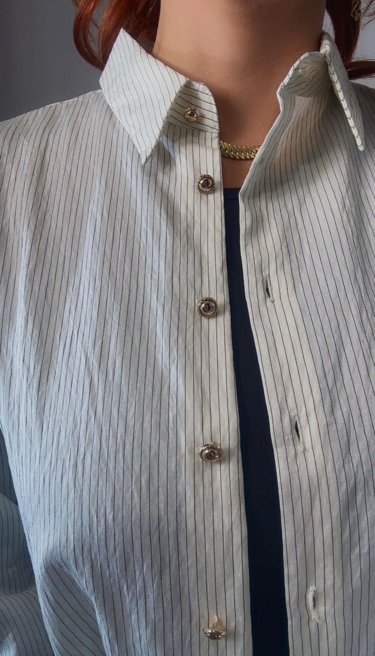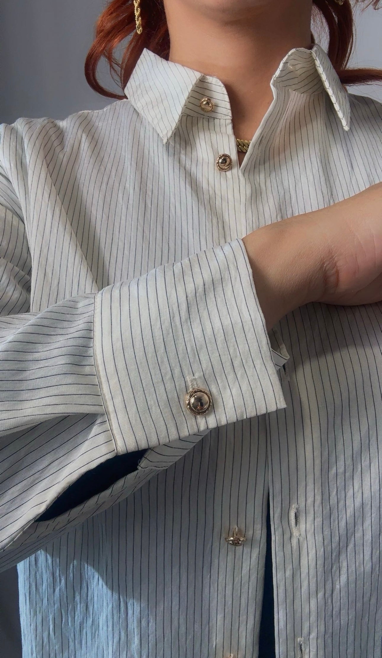 Примечание: Эта рубашка пыльно-бежевого цвета с тонкими вертикальными полосками создана для сдержанной элегантности. Классический воротник, манжеты на рукавах, винтажные пуговицы и современный крой с высоким-низким вырезом (короче спереди, длиннее сзади).