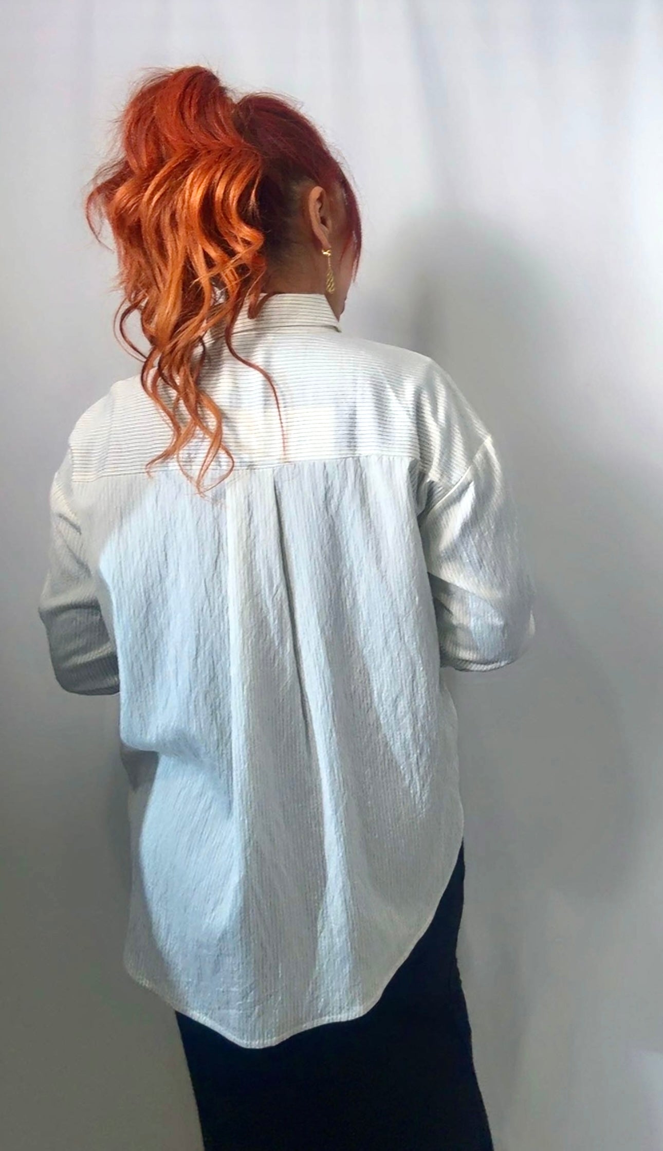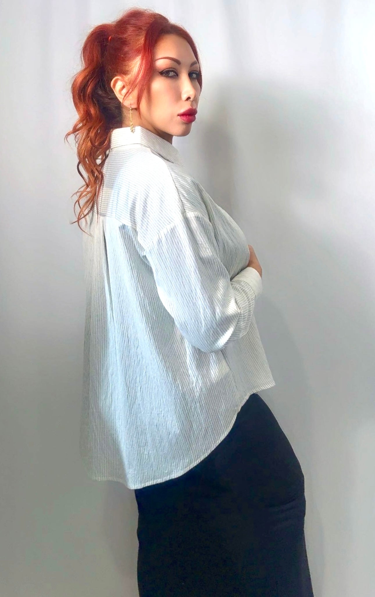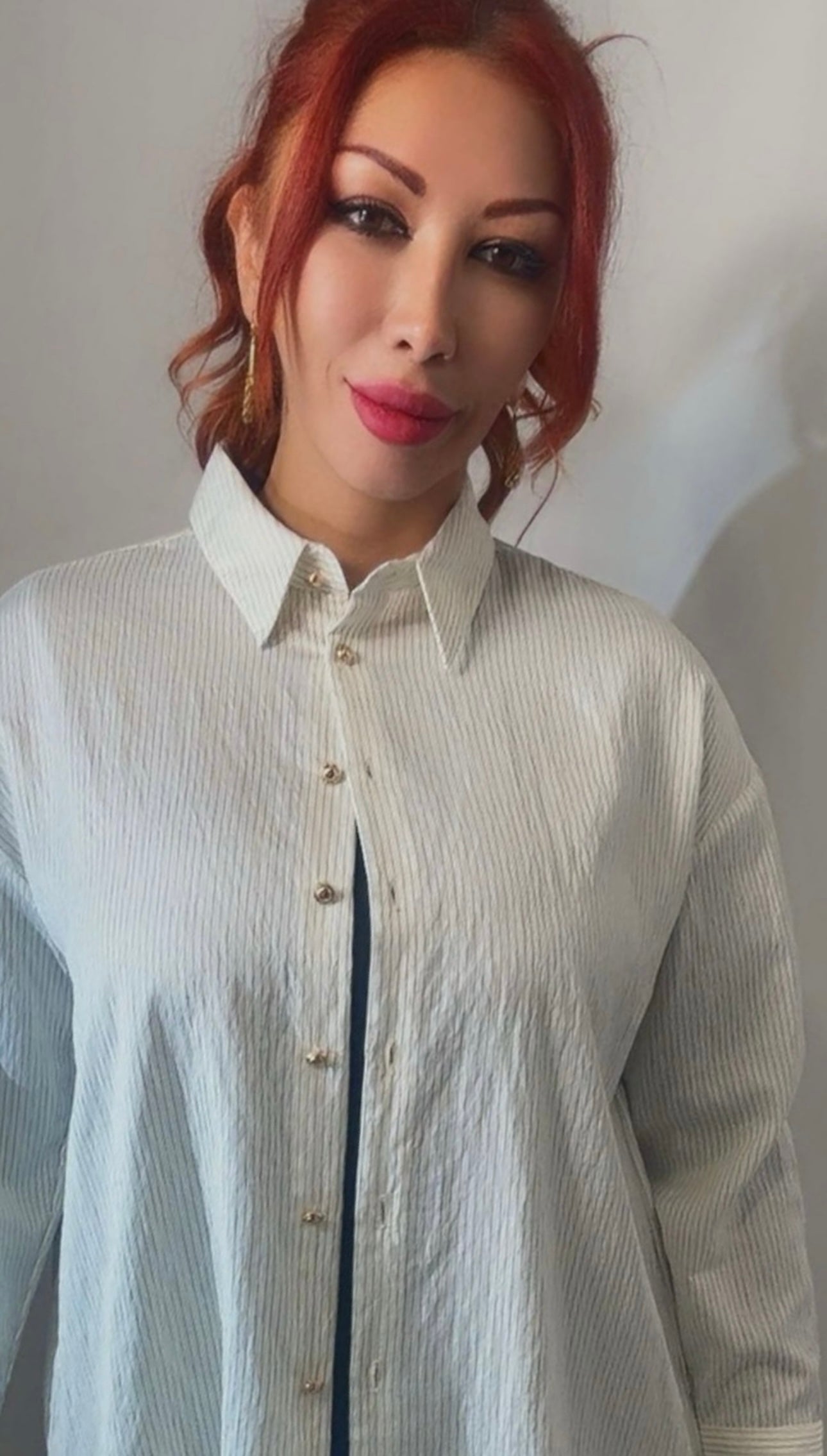 Примечание: Эта рубашка пыльно-бежевого цвета с тонкими вертикальными полосками создана для сдержанной элегантности. Классический воротник, манжеты на рукавах, винтажные пуговицы и современный крой с высоким-низким вырезом (короче спереди, длиннее сзади).