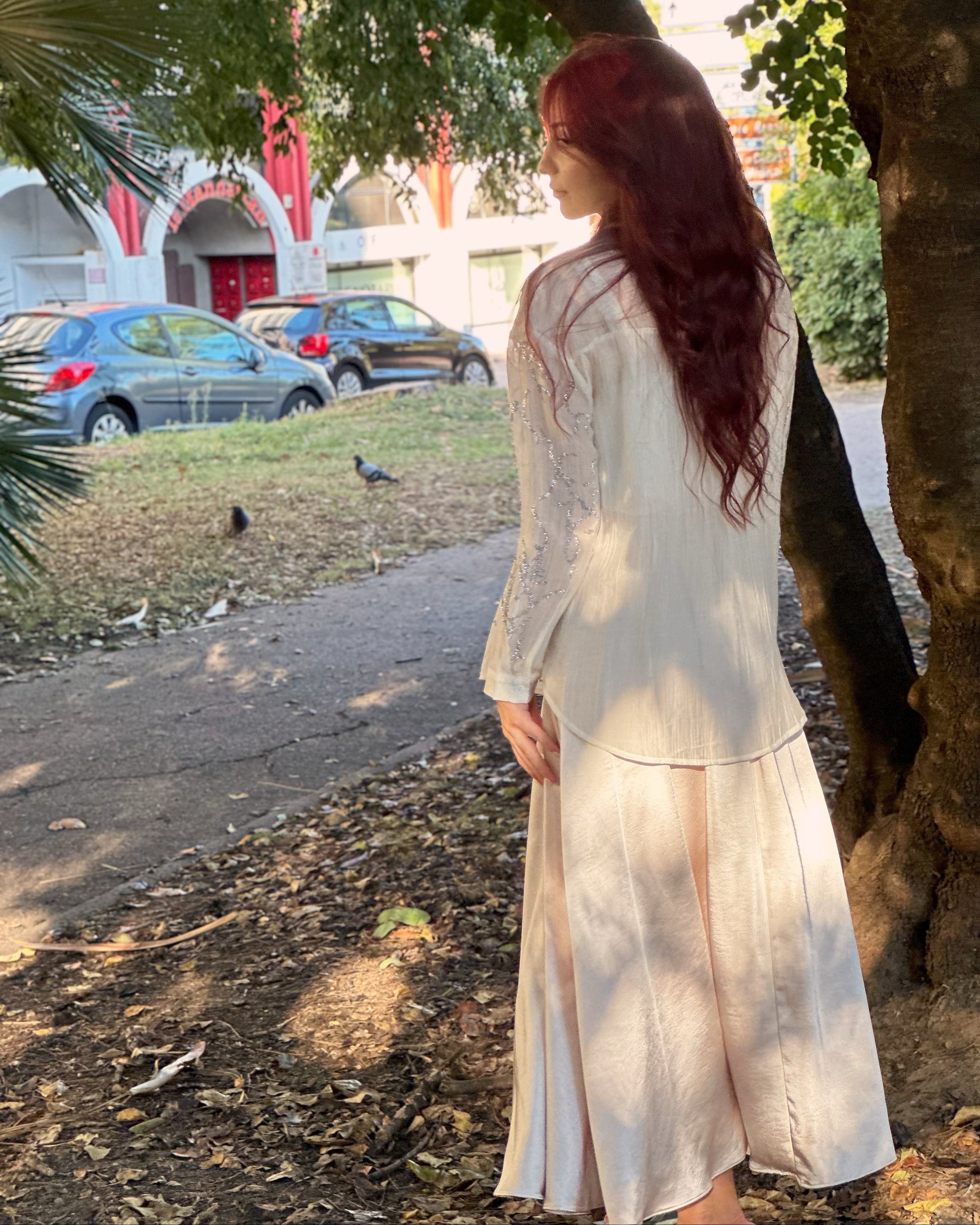 Примечание : Роскошная рубашка нежного оттенка слоновой кости, изящно вышитая и украшенная мерцающими бусинами. Воротник с отделкой из драгоценных камней добавляет немного блеска, а свободный силуэт и полупрозрачная ткань придают элегантность и текучесть. Идеальная вещь для утонченной изысканности.