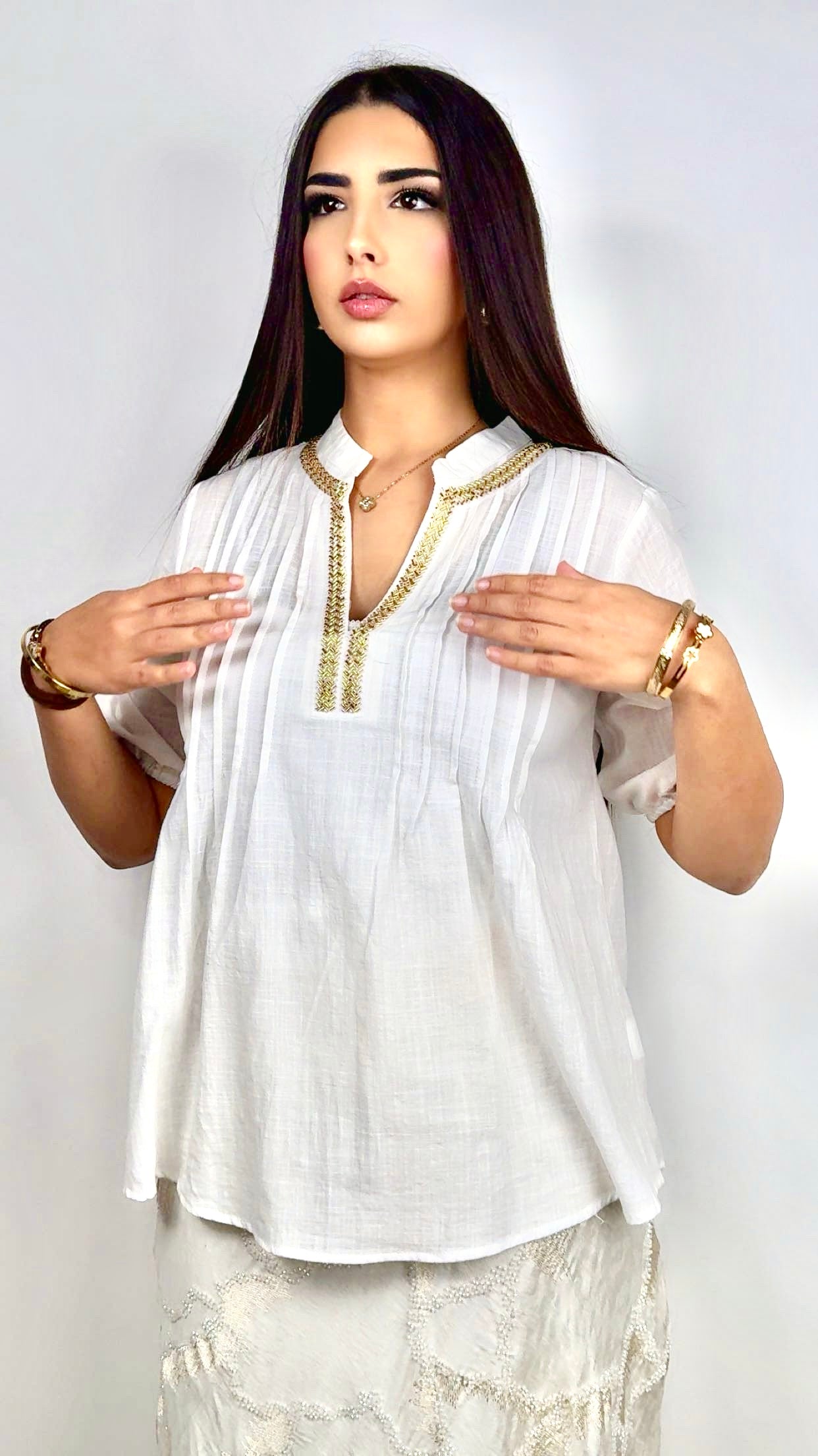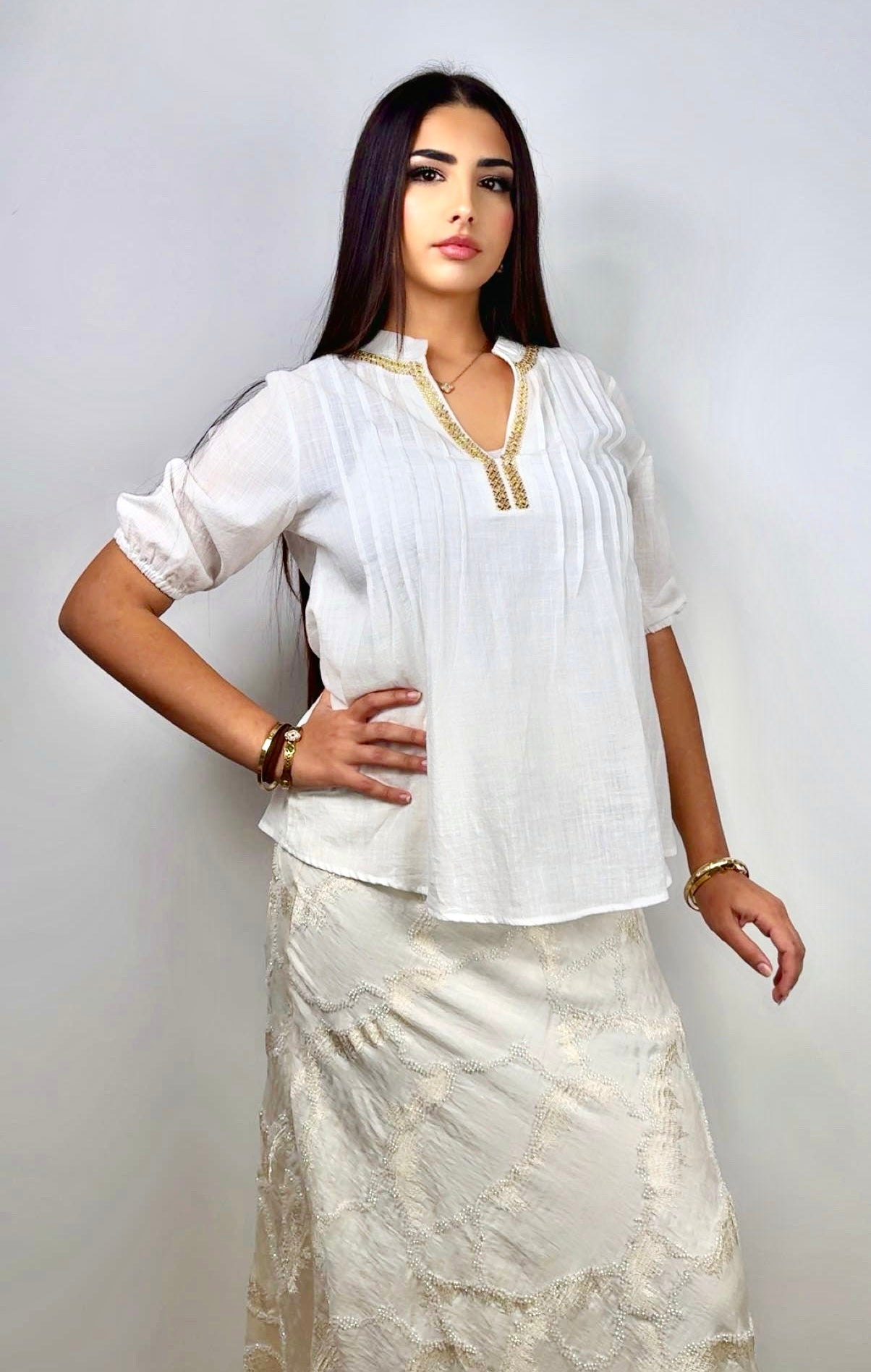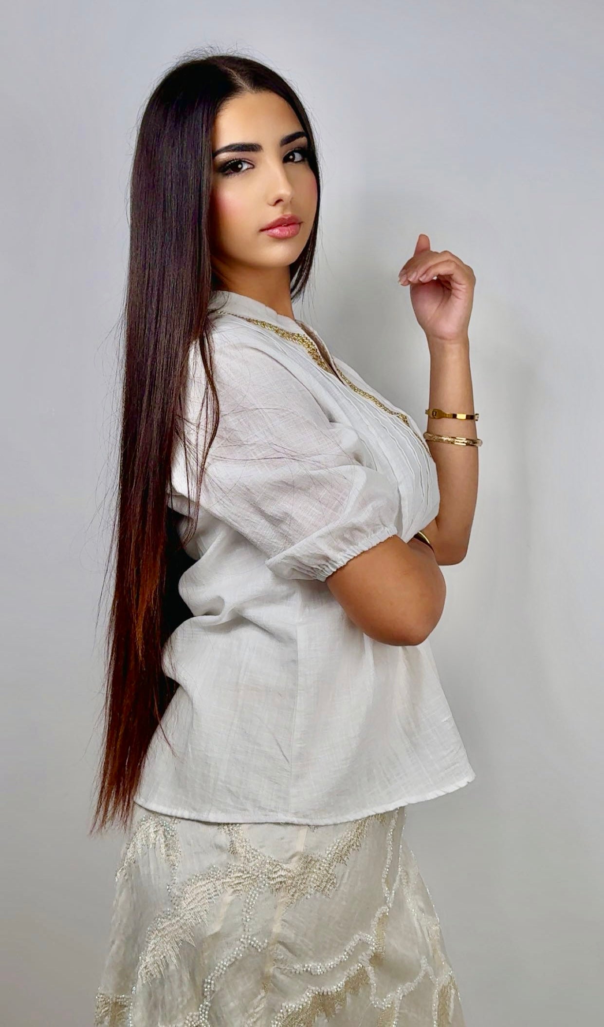Примечание : Легкая и изысканная рубашка из 95% хлопка с нежными золотистыми бусинами и пайетками вдоль горловины. Рукава отделаны мягкими эластичными манжетами для женственности. Идеально подходит для особых моментов и повседневной элегантности.