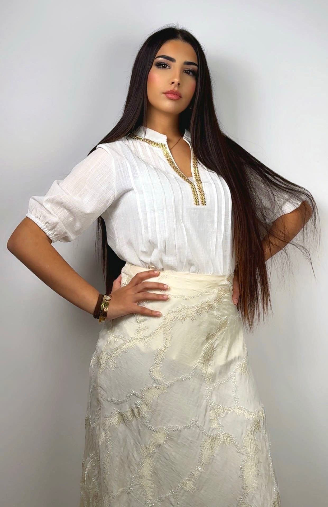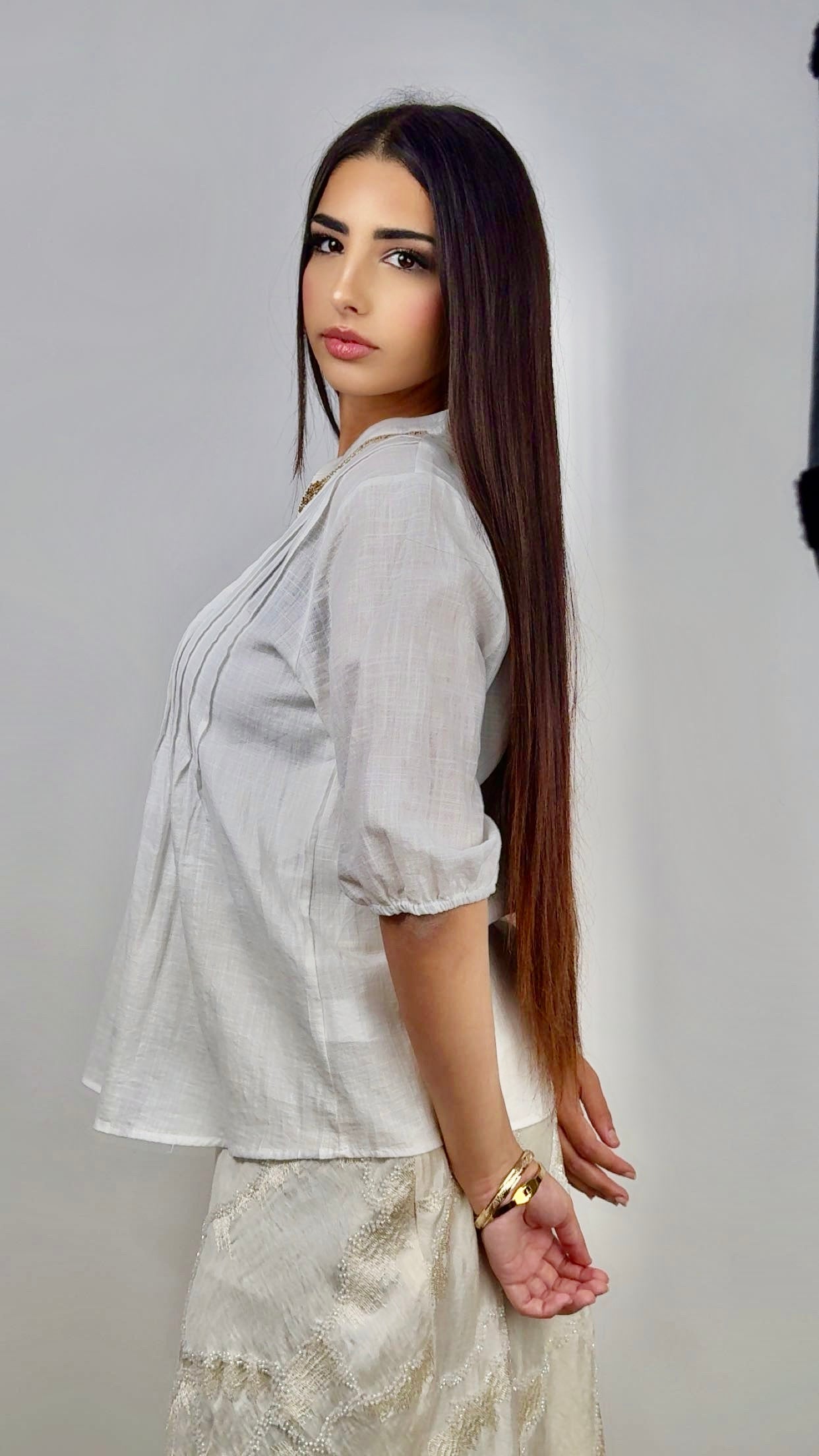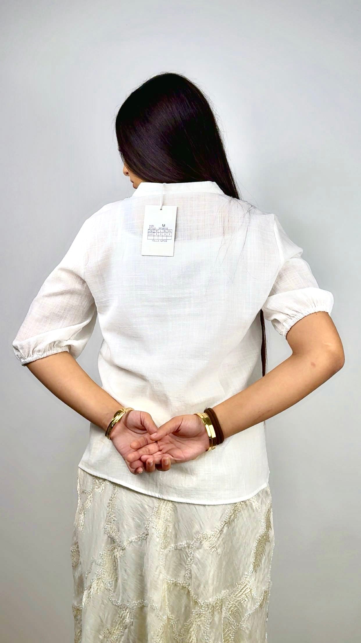Примечание : Легкая и изысканная рубашка из 95% хлопка с нежными золотистыми бусинами и пайетками вдоль горловины. Рукава отделаны мягкими эластичными манжетами для женственности. Идеально подходит для особых моментов и повседневной элегантности.