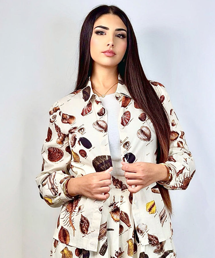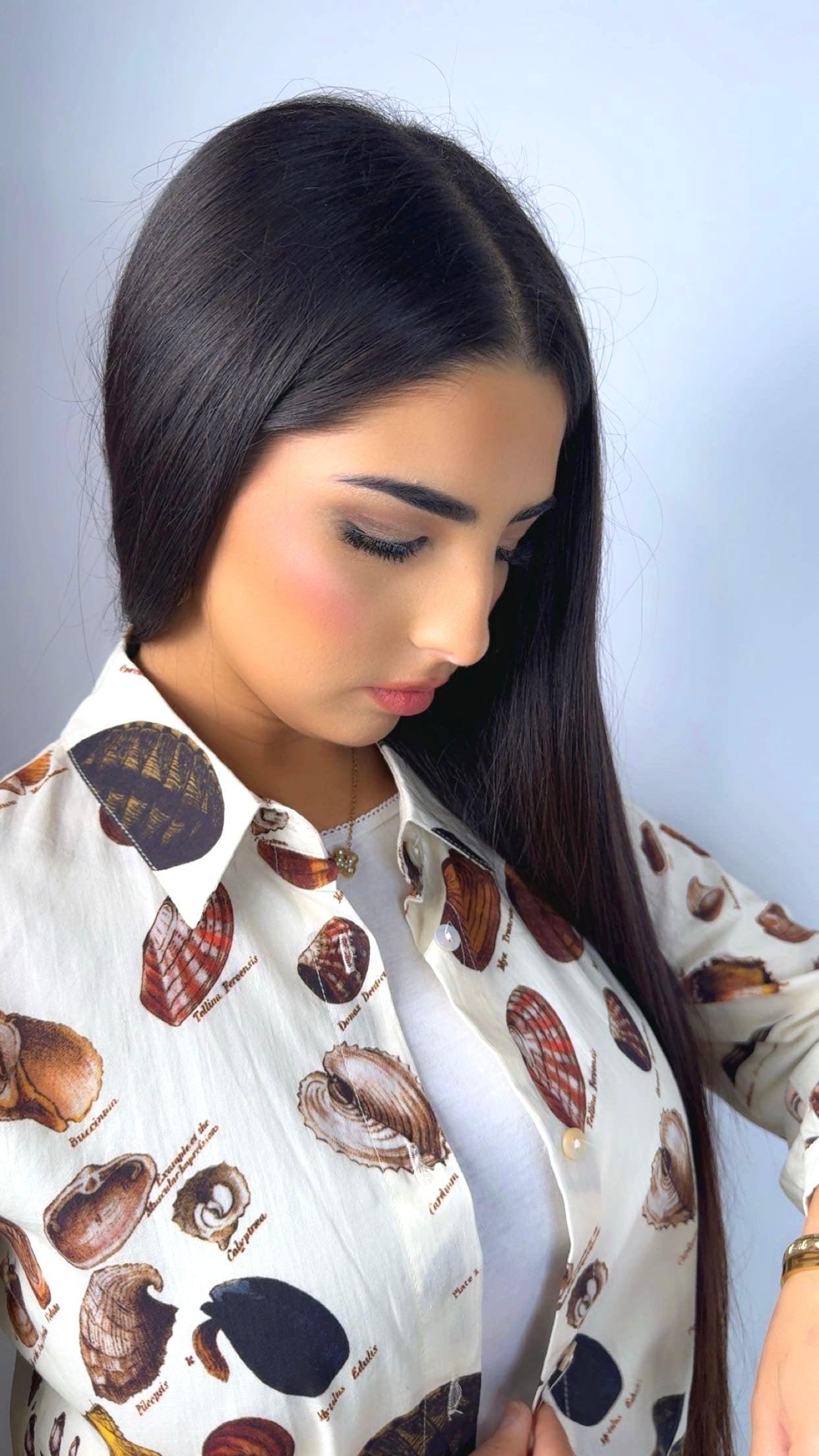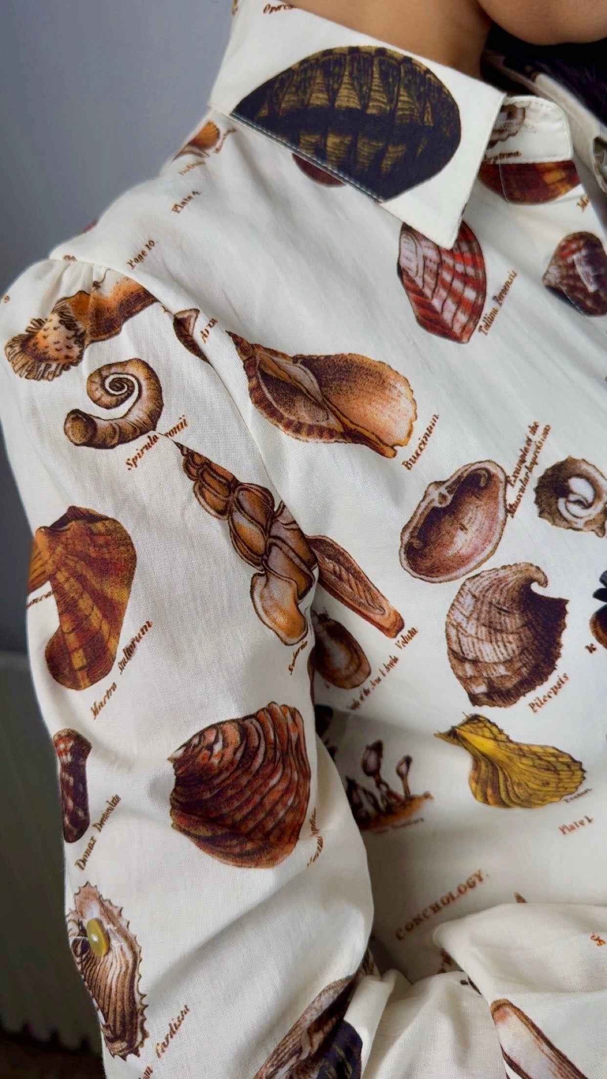Почувствуйте ритм моря с этой прекрасной рубашкой с уникальным принтом в виде ракушек и кораллов. Мягкая на ощупь и облегающая по фигуре, она создана для того, чтобы привнести прибрежное очарование в ваш повседневный гардероб. Изысканные манжеты добавляют нотку изысканности, делая ее идеальной как для повседневного, так и для шикарного стиля. Сочетайте ее с джинсами или юбкой, и пусть ваш наряд расскажет историю.