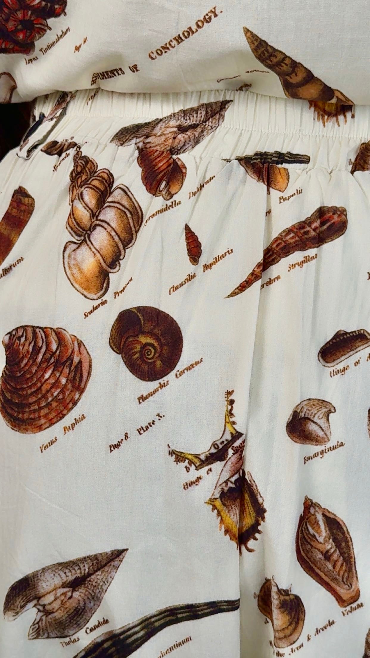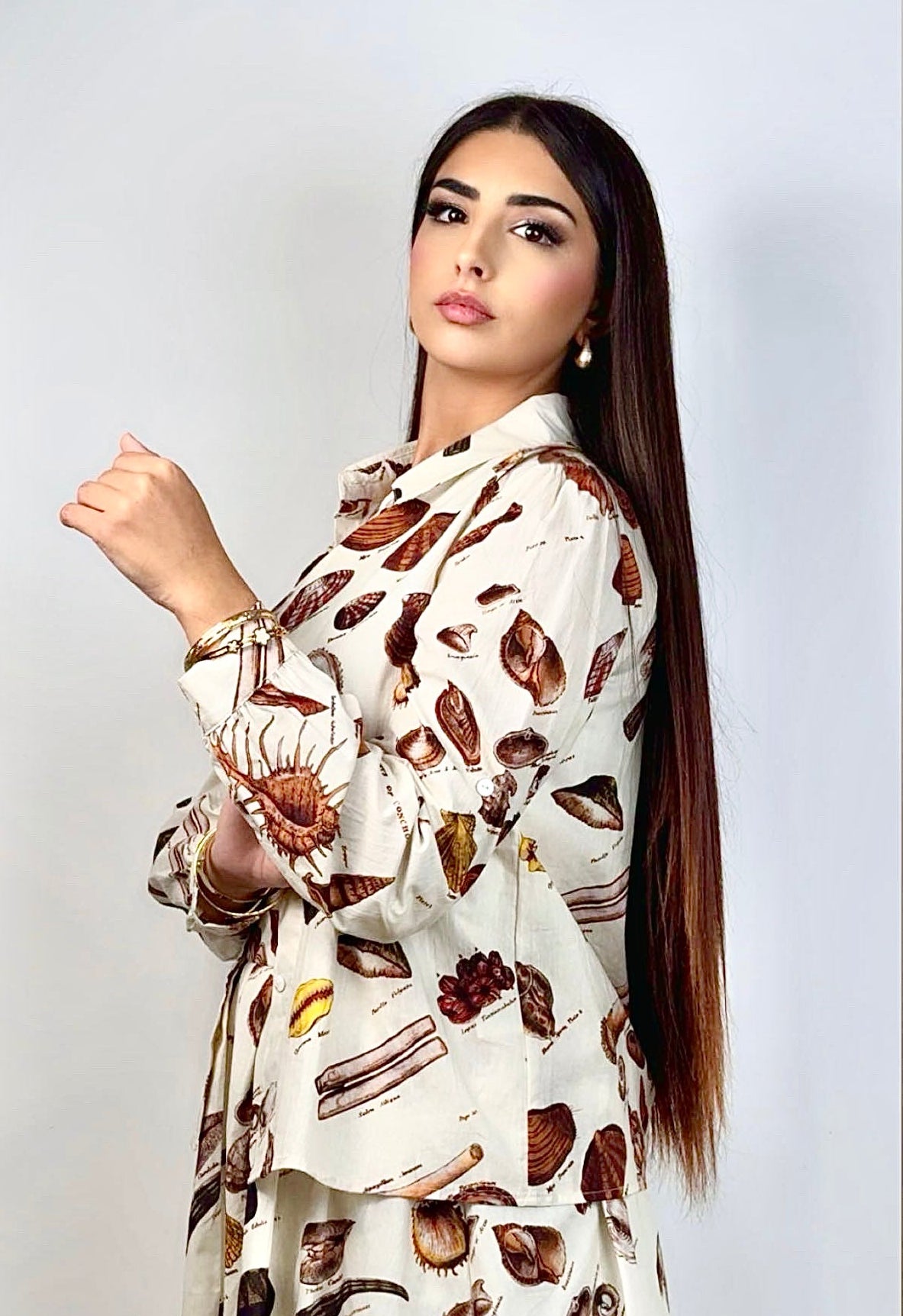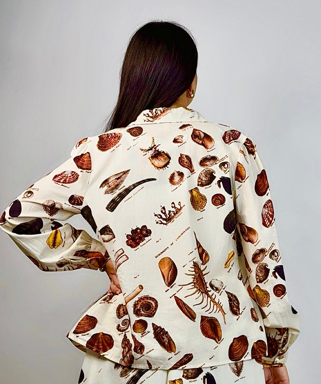 Почувствуйте ритм моря с этой прекрасной рубашкой с уникальным принтом в виде ракушек и кораллов. Мягкая на ощупь и облегающая по фигуре, она создана для того, чтобы привнести прибрежное очарование в ваш повседневный гардероб. Изысканные манжеты добавляют нотку изысканности, делая ее идеальной как для повседневного, так и для шикарного стиля. Сочетайте ее с джинсами или юбкой, и пусть ваш наряд расскажет историю.
