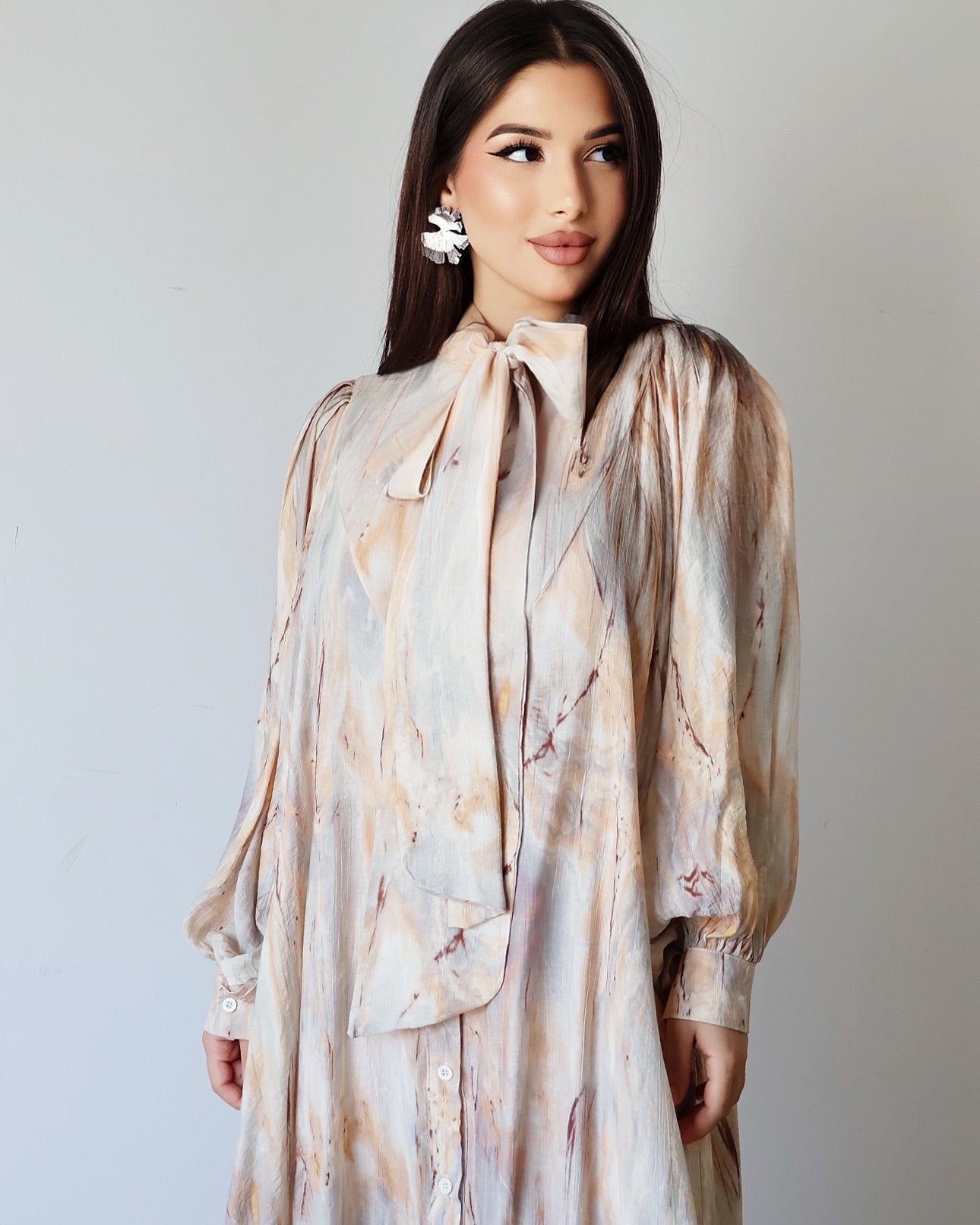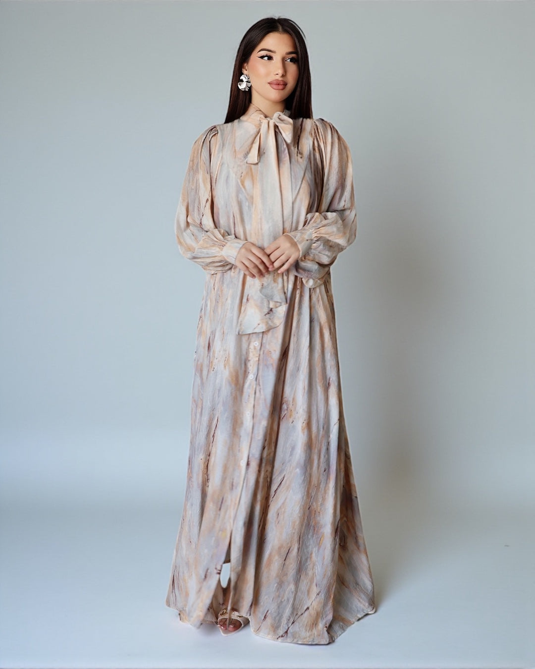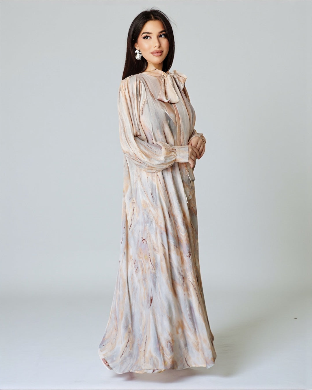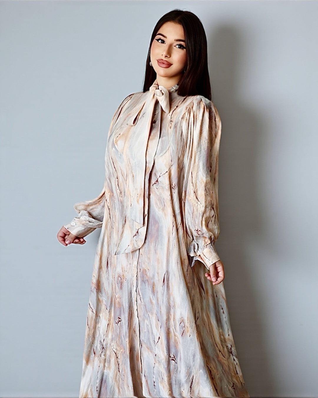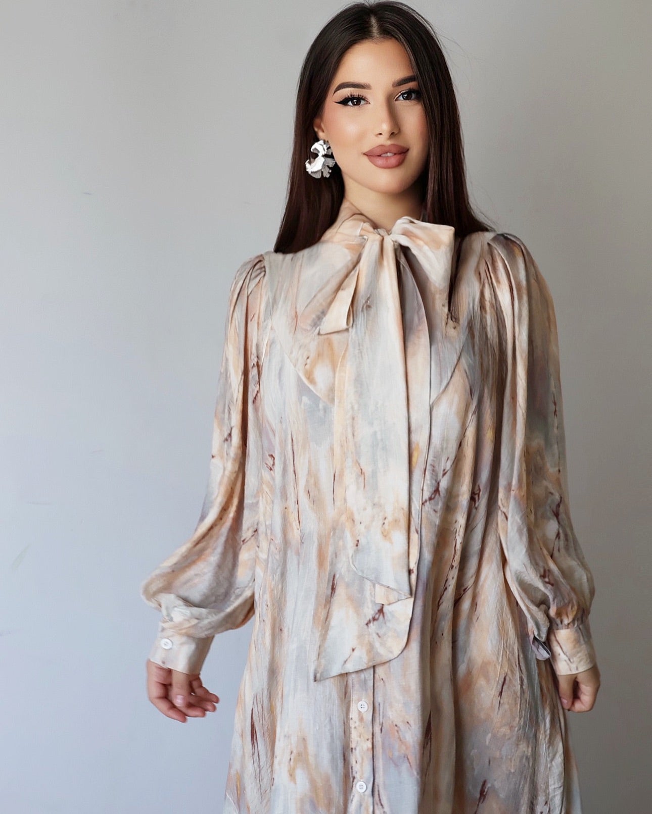Примечание: Элегантное расклешенное платье из 90% мягкой вискозы. Приталенное сверху и широко струящееся от талии вниз с плиссированным эффектом. Вырез завязывается на нежный бант, добавляя очарования и женственности. Легкое, воздушное и идеально подходит для теплых дней или элегантных случаев.