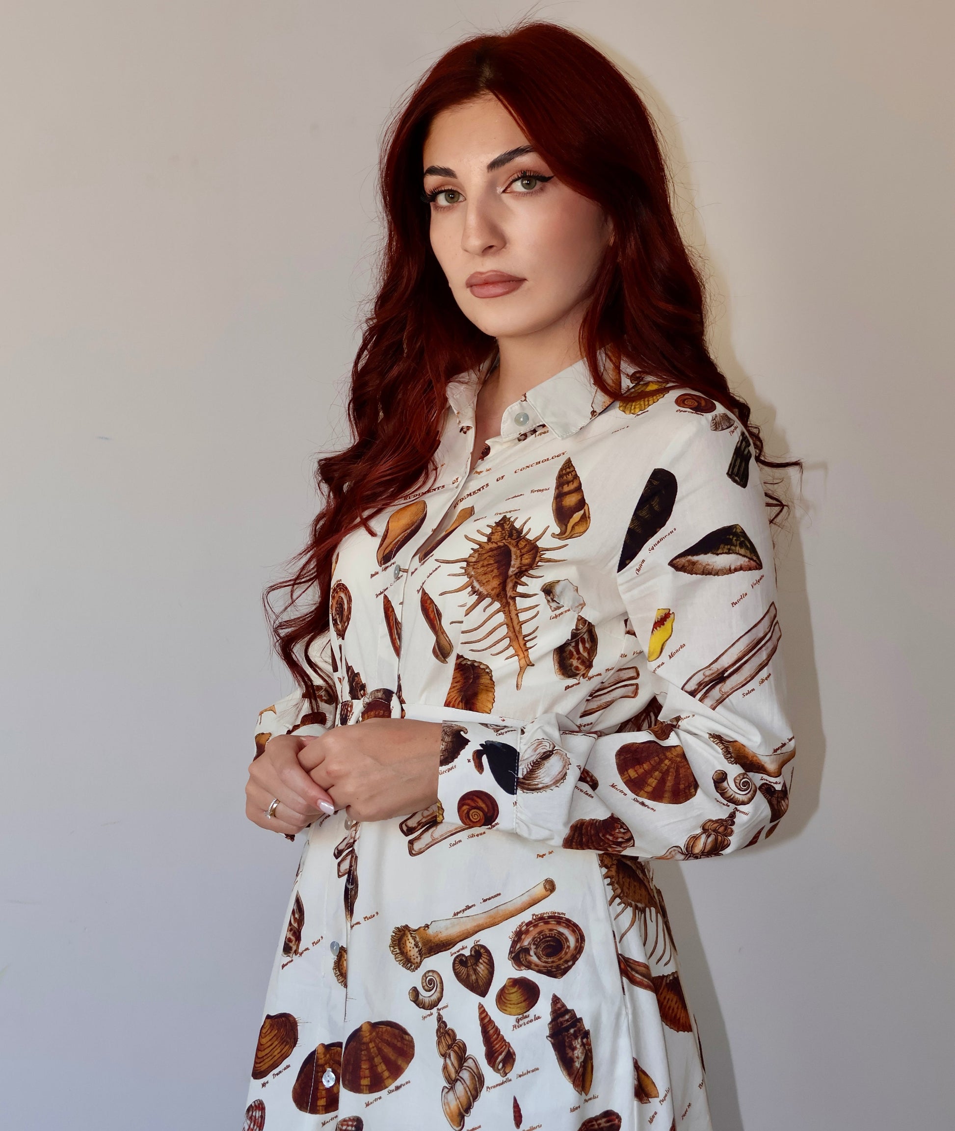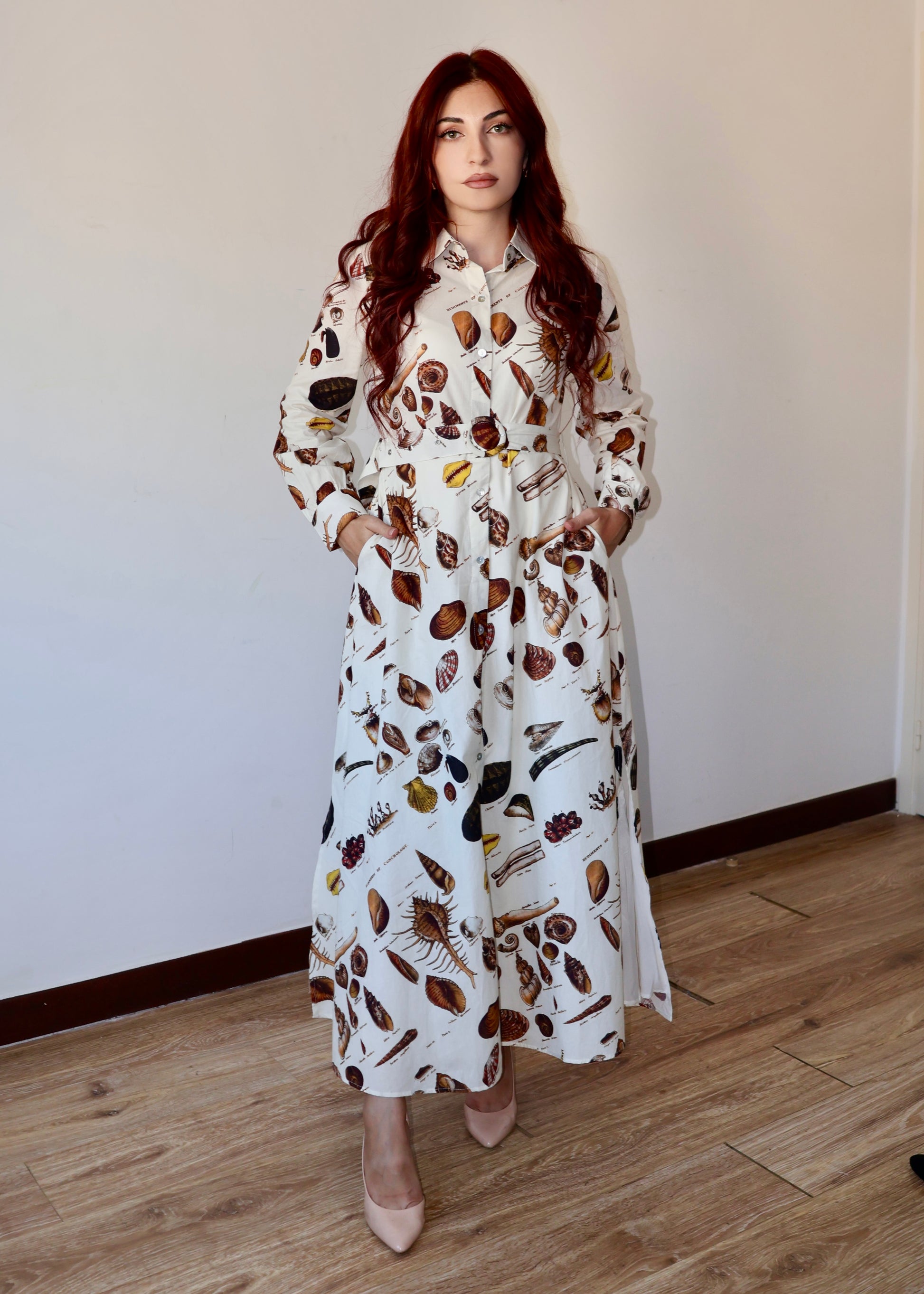 Уникальный принт с ракушками и океаном, боковые карманы, структурированный воротник и два элегантных боковых разреза. Идеально подходит для теплых дней и прогулок по морю