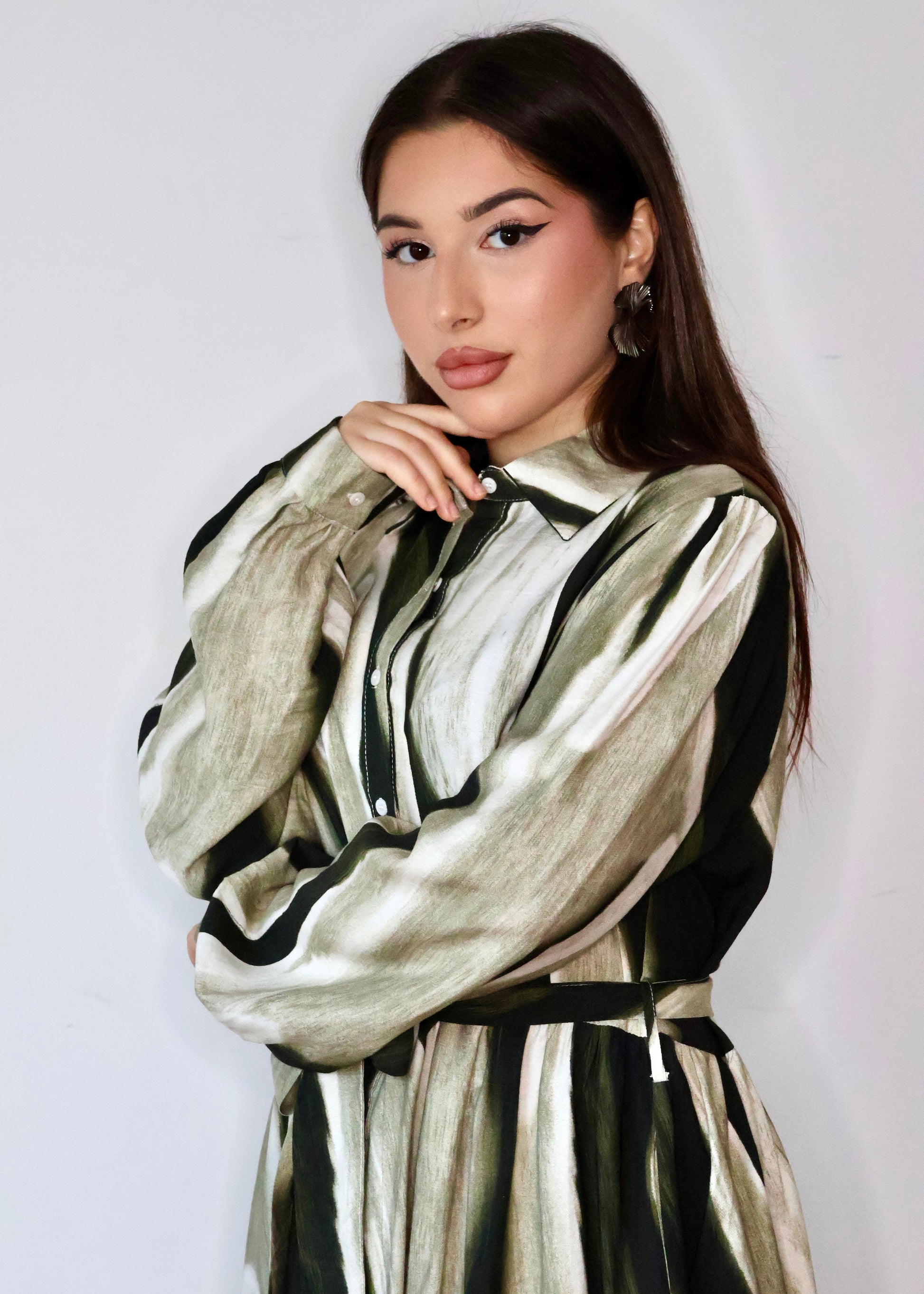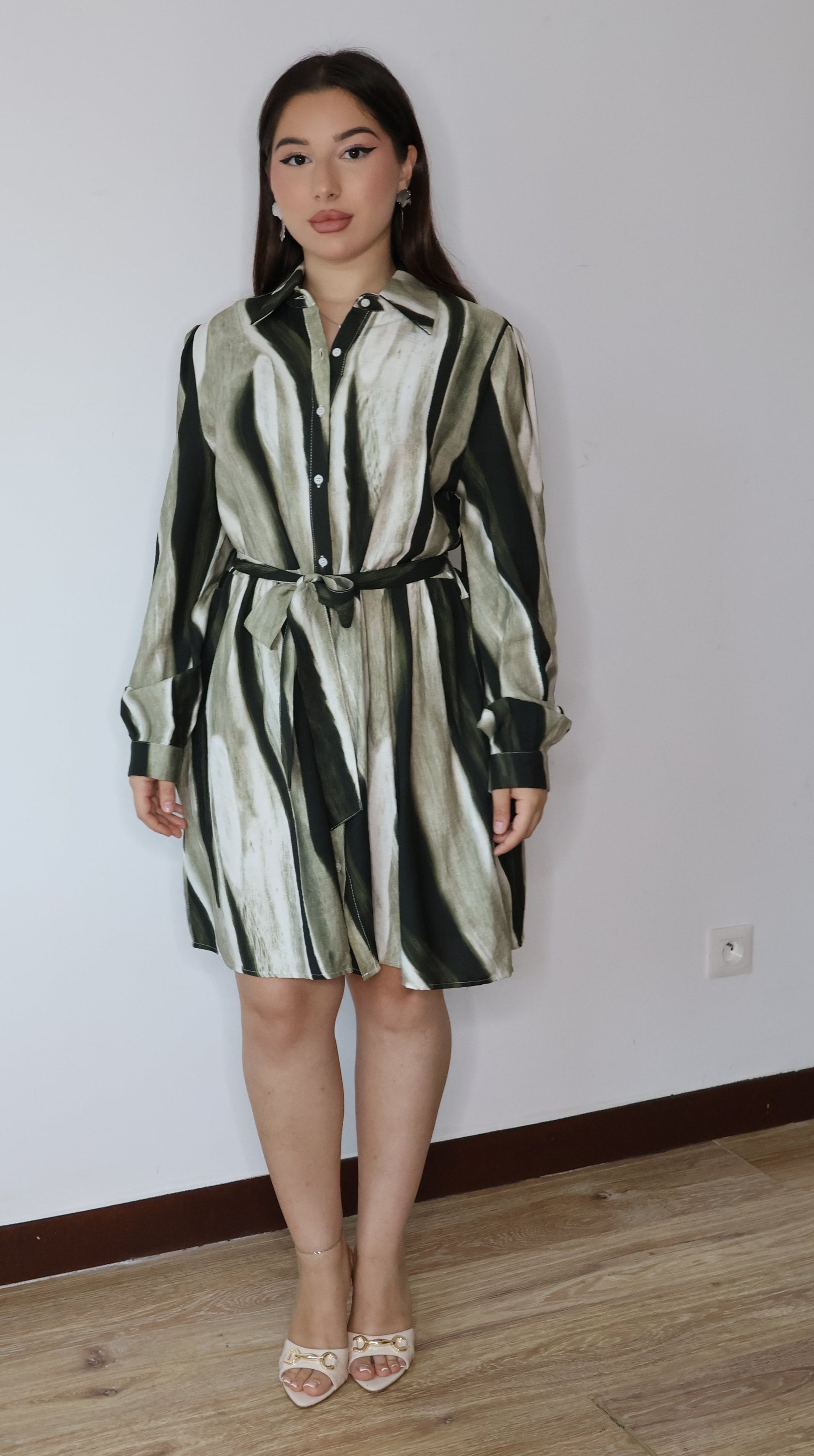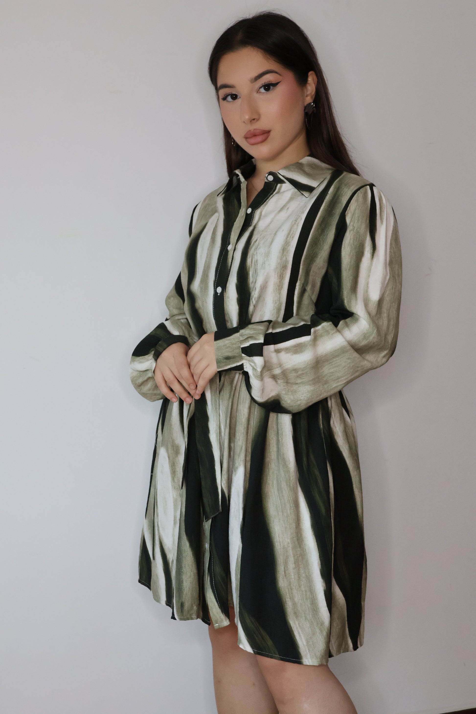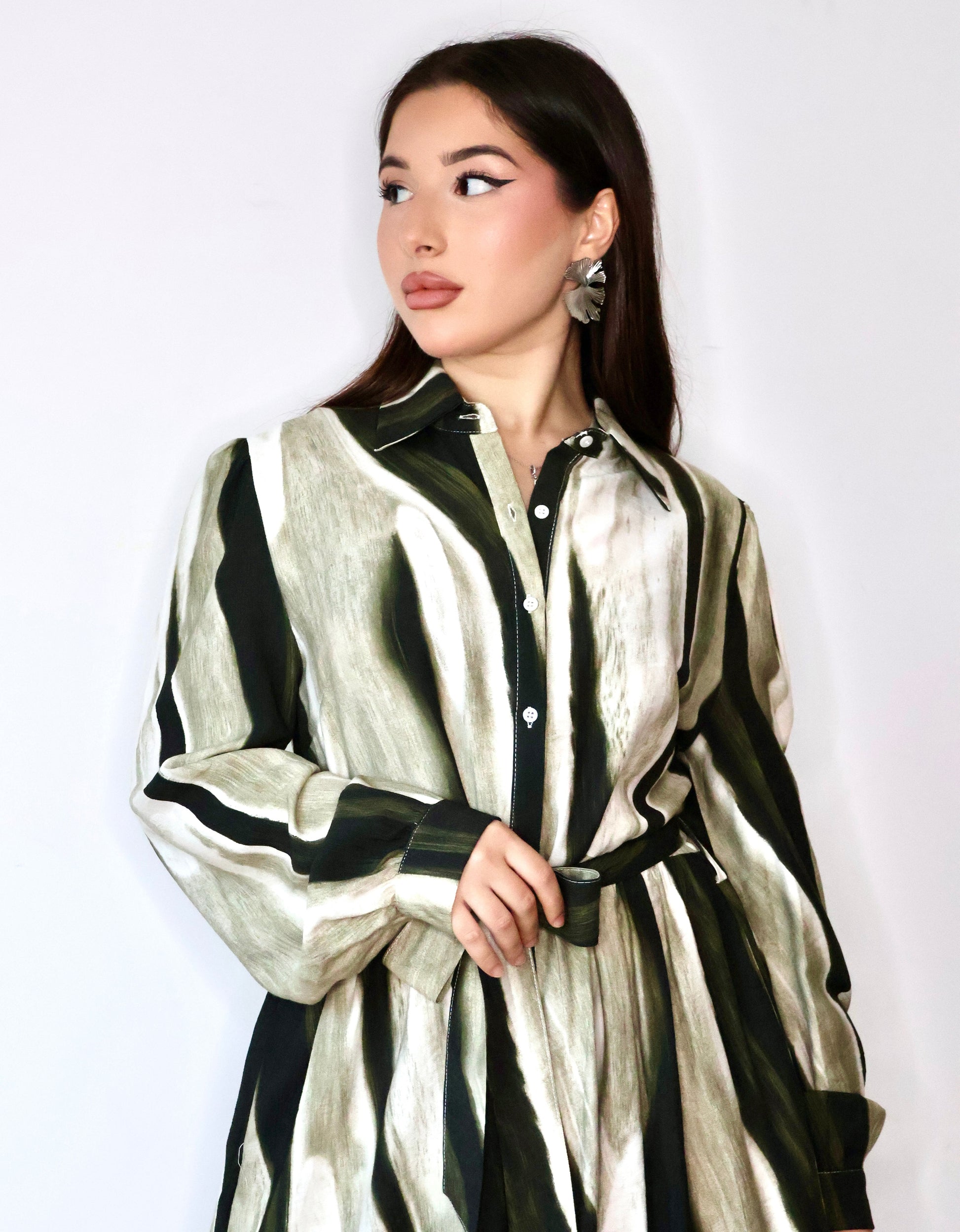 Примечание . Элегантное платье-рубашка длиной до колена с нежным акварельным полосатым принтом в бежево-оливковых тонах.