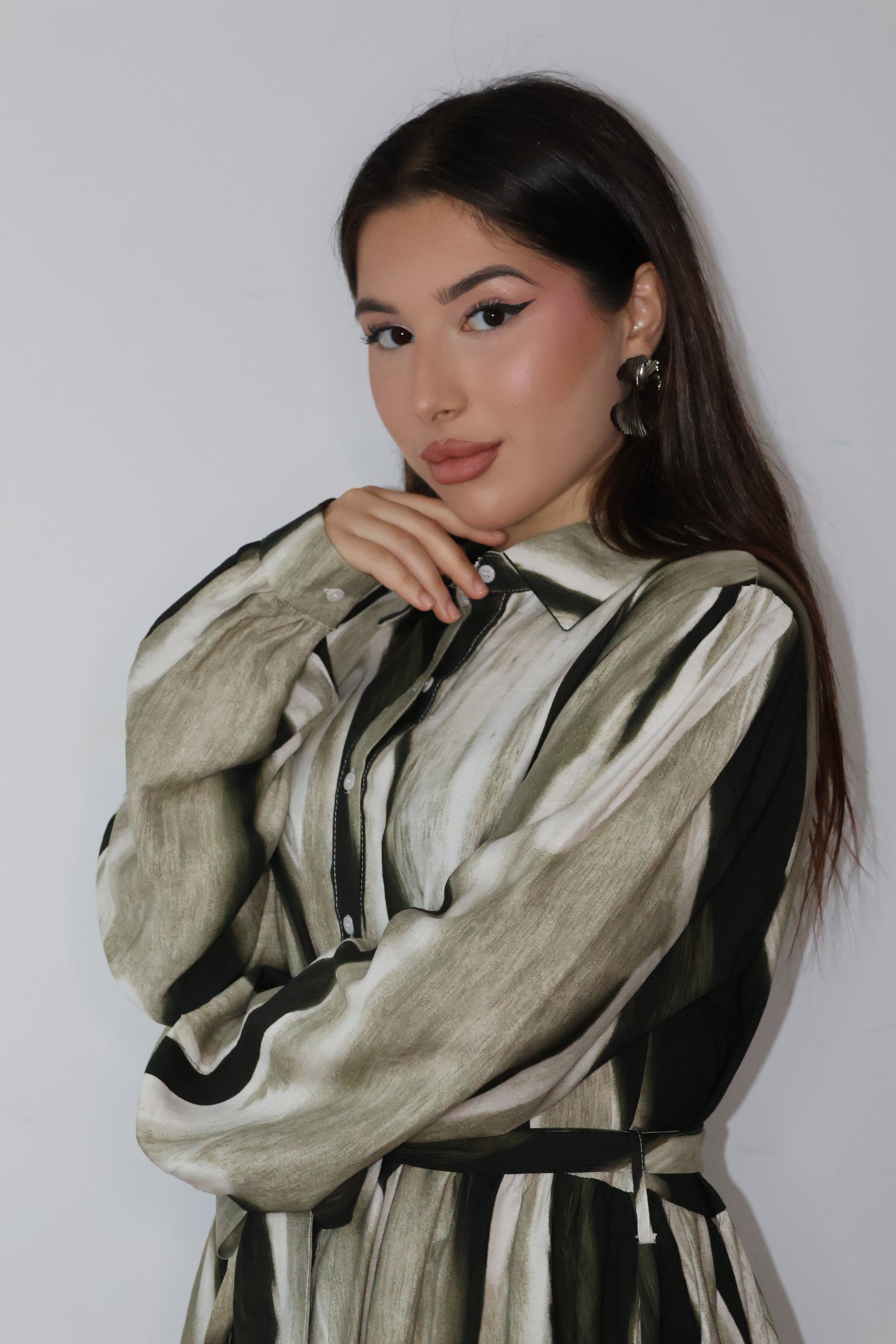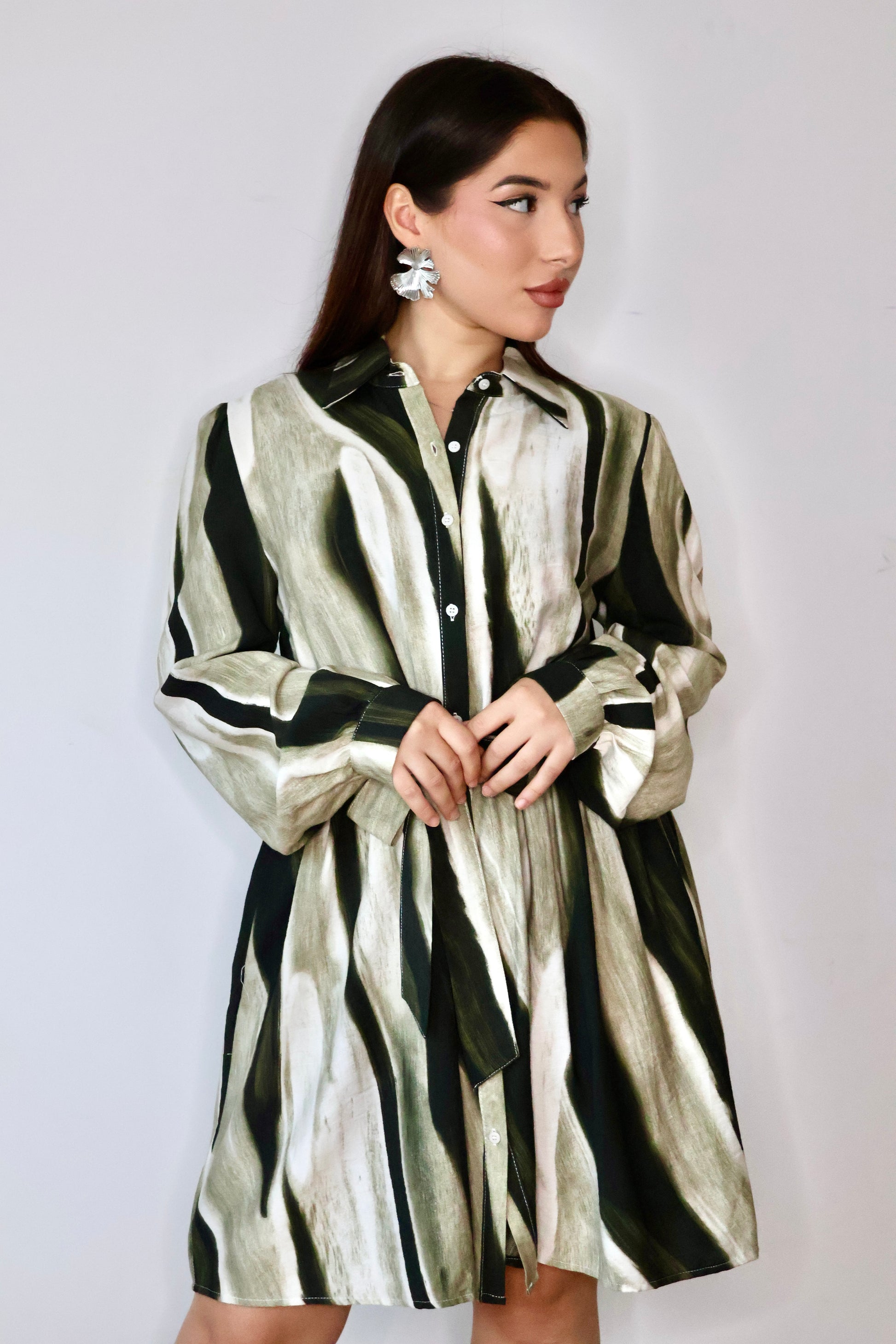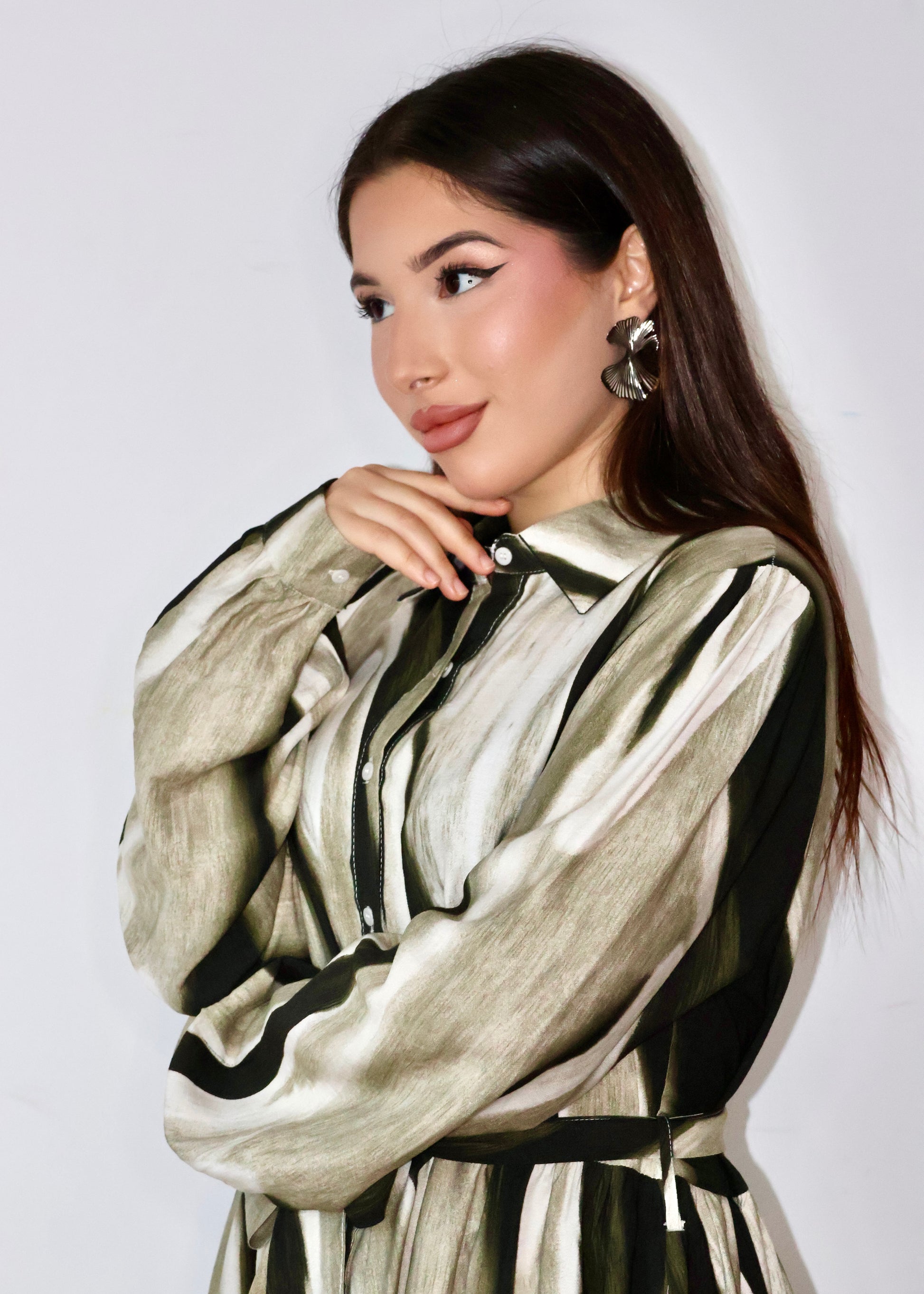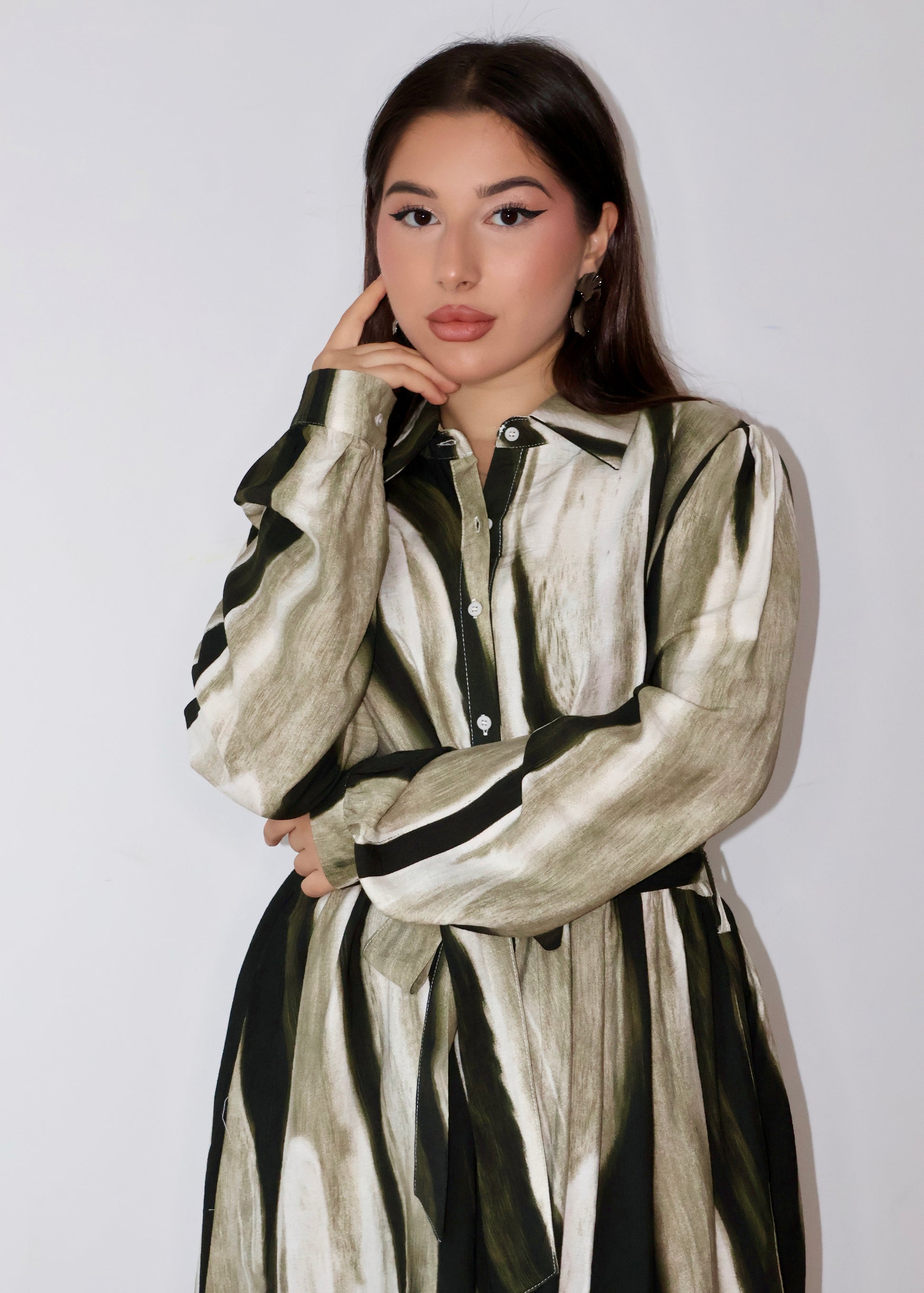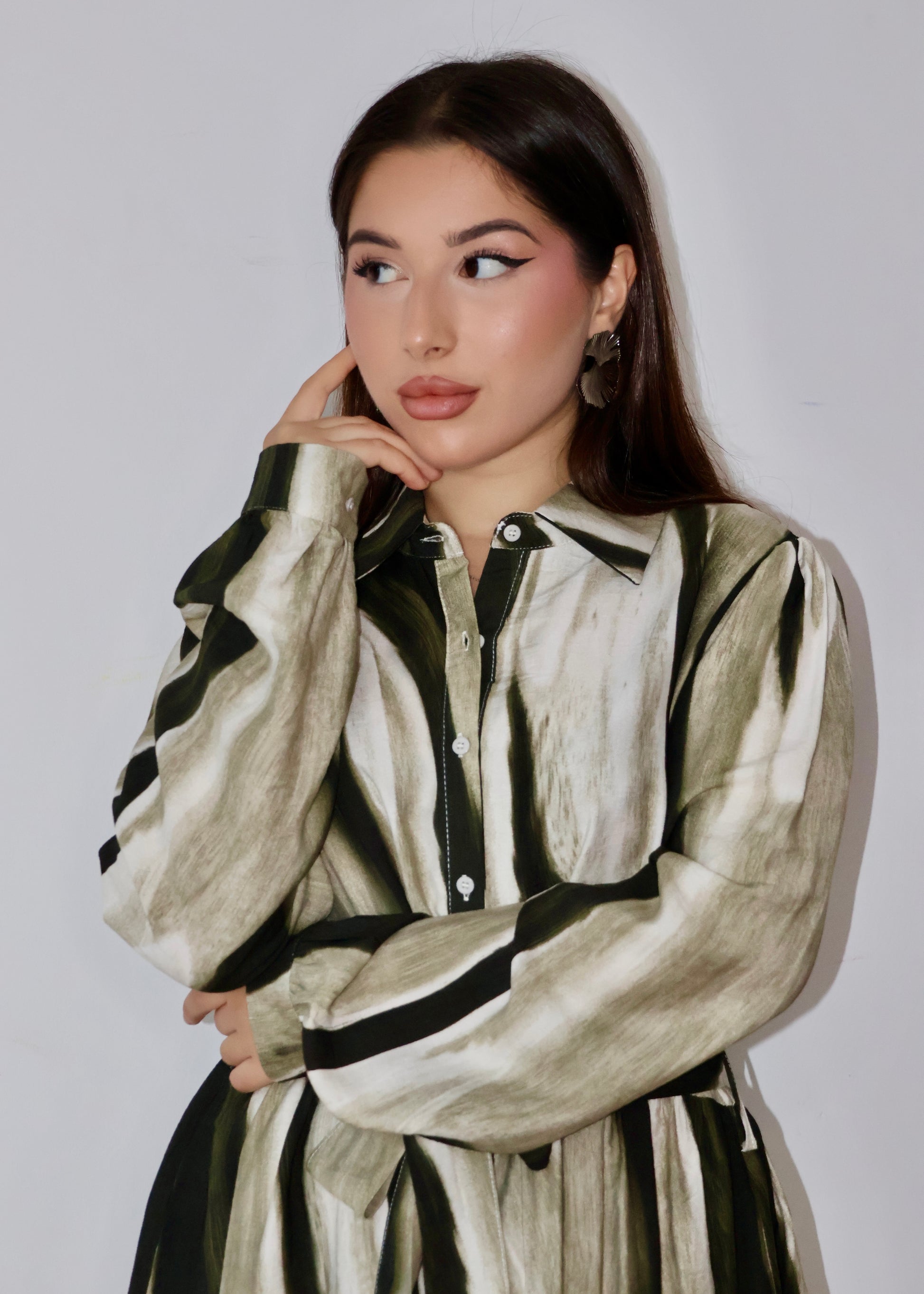 Примечание . Элегантное платье-рубашка длиной до колена с нежным акварельным полосатым принтом в бежево-оливковых тонах.