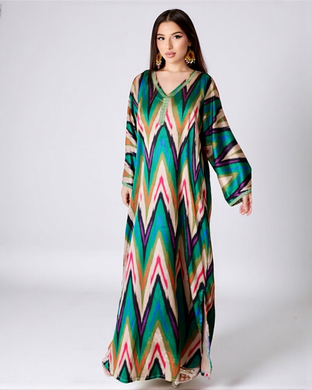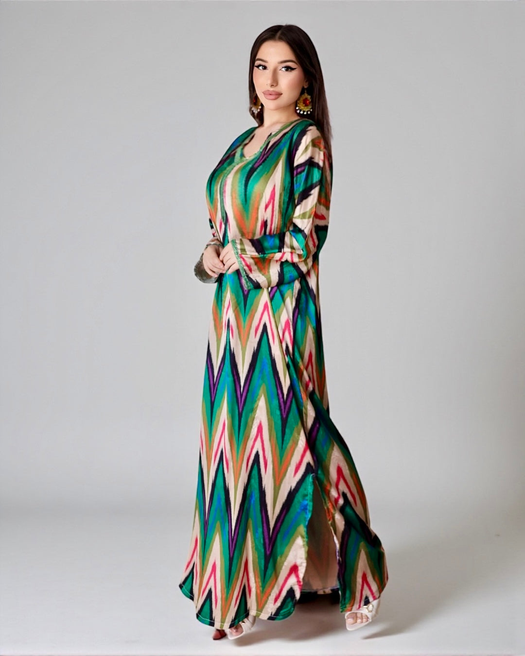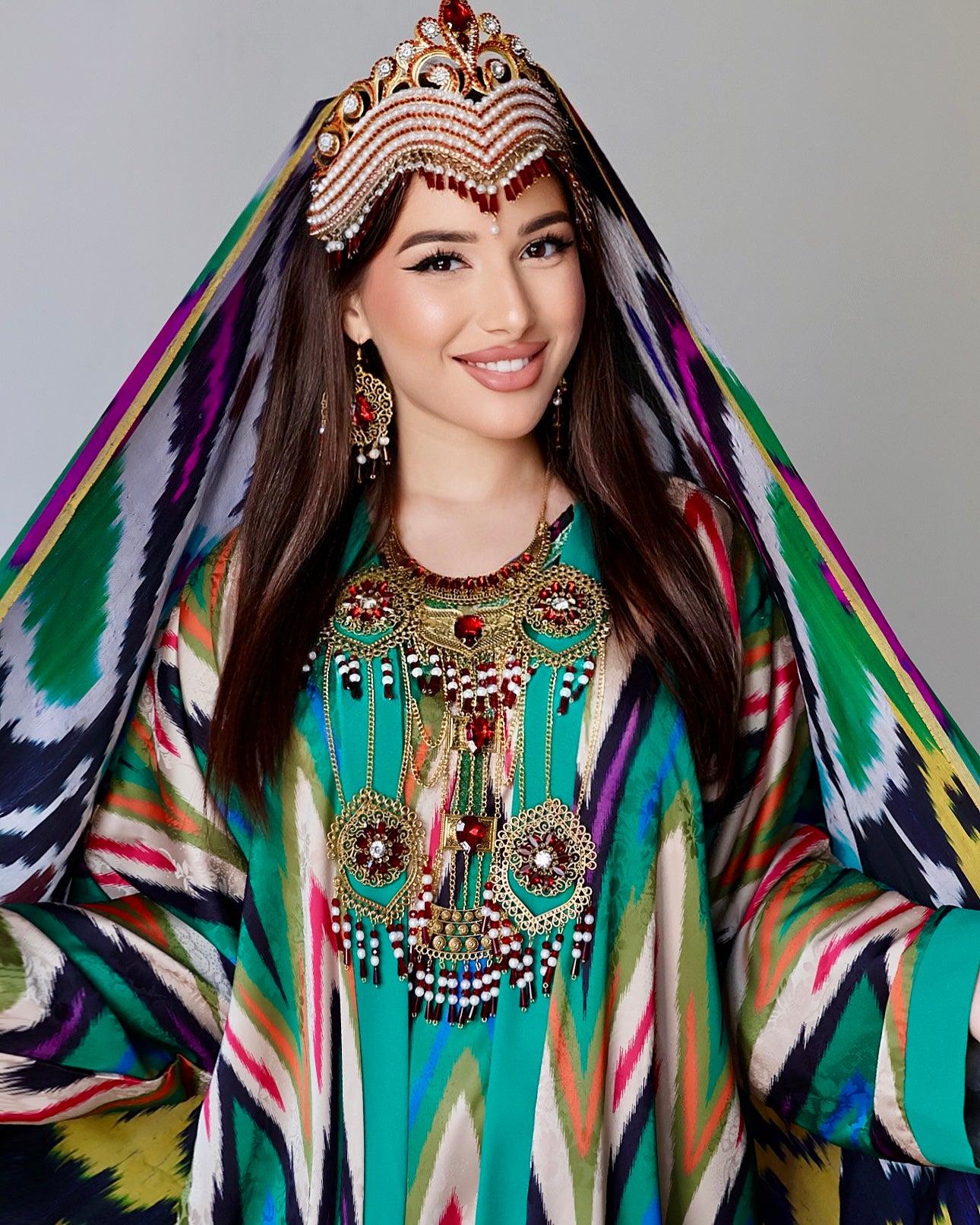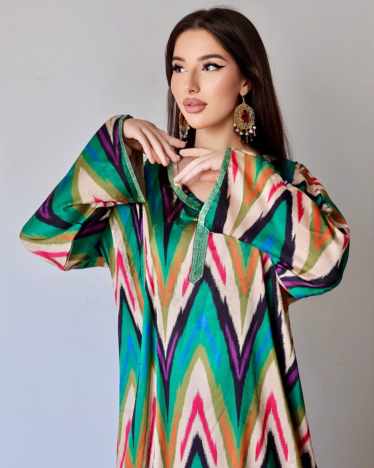 Примечание : Это платье, изготовленное из тончайшего узбекского шелка с изысканным узором икат, легкое, воздушное и прекрасно женственное. Каждый шаг в нем ощущается как танец с восточным